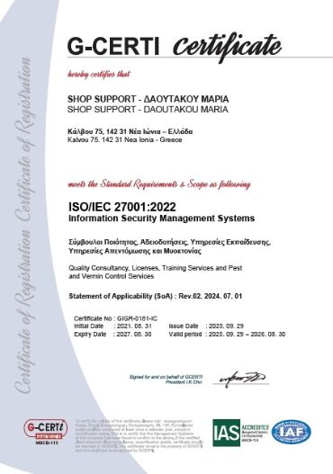 Η υπηρεσία αφορά την καθοδήγηση σύμφωνα με το ισχύον νομοθετικό πλαίσιο, την παρακολούθηση τήρησης των απαιτούμενων αρχείων, τη σύνταξη οδηγιών εργασίας, την εκπαίδευση του προσωπικού. Τα αποτελέσματα των επισκέψεων και οι προτάσεις μας συντελούν στην παρακολούθηση της αποτελεσματικότητας και στην τήρηση στατιστικών στοιχείων για τη λειτουργία της επιχείρησης.